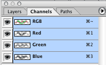 An RGB image in Photoshop, showing the 3 separate and composite (RGB) channels.