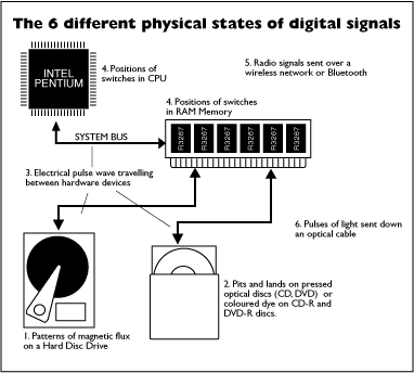 When a binary electrical pulse wave has arrived at a RAM, FlashRAM or ROM memory module or the CPU, the waves on/off states are translated into on/off positions of millions of switches (transistors) which temporarily "hold" the binary values.